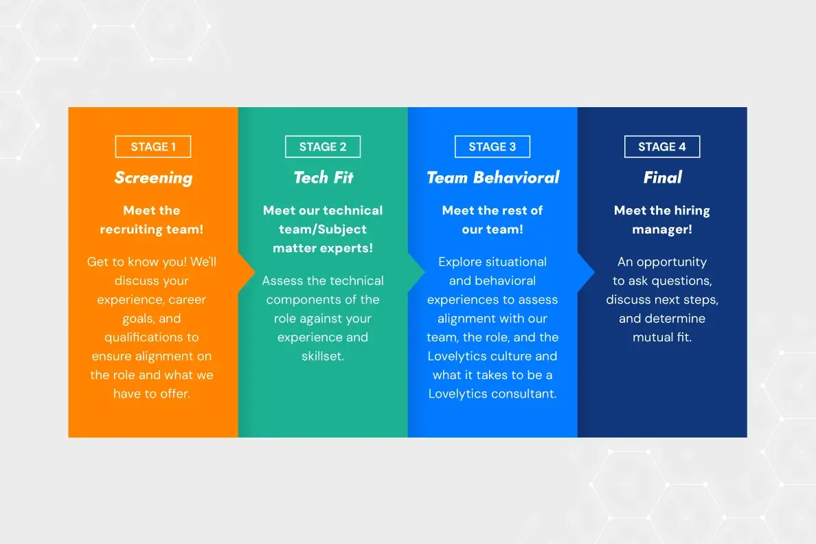 Lovelytics does not currently require candidates to complete technical “take home” assessments or case studies. Instead, candidates participate in an in-depth technical interview that explores relevant frameworks, analytics methodologies, and role-specific technical concepts.