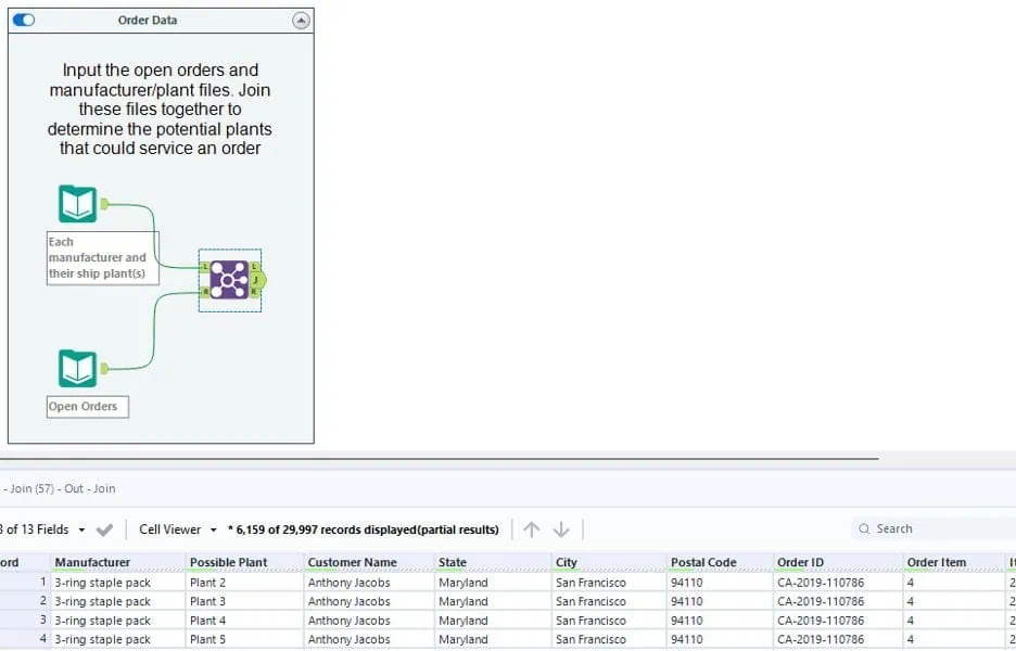 We’ll start by importing our files into Alteryx. We have one file that contains the manufacturer master data and the relationship between which plants can ship which manufacturer brands. We’ll join this data with our open orders to create a data set of all possible order/plant combinations. As an example, you can see that for a given order and line item (CA-2019-110786 line 4) there are 4 possible plants that could fulfil the order.