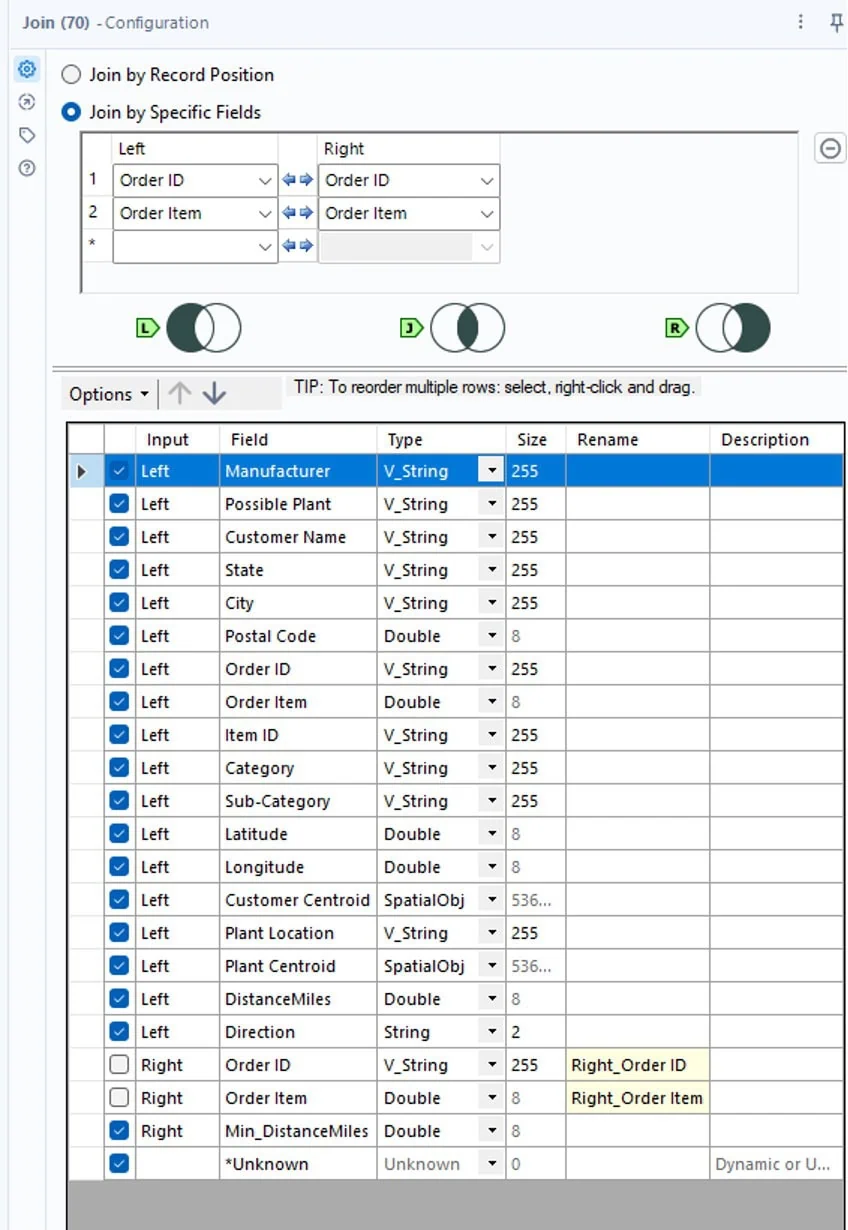 We’ll join these results back to our original data source by adding a join tool to our canvas. We’ll connect the distance tool output anchor to the left join input anchor and the summarize tool output anchor to the right join input anchor. We will join on order ID and order item and configure the embedded select tool to include the new “Min_DistanceMiles” field.