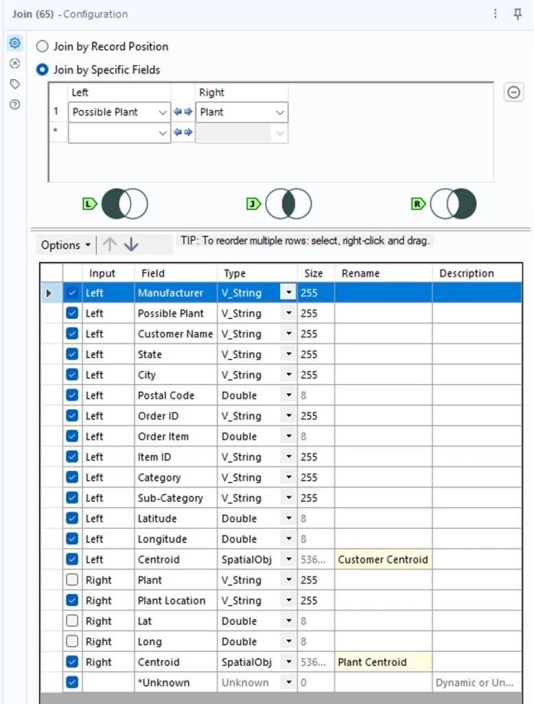 Now, to calculate the distance between these two points that we created (one for each customer location and one for each plant location), we need to join them so they’re in the same data set. To do this, we’ll add a join tool to our canvas. The fields to join on are “Possible Plant” from our open order data and the plant field from our plant location data. You’ll see that we now have our open order information, a “Customer Centroid” field for each customer location, and a “Plant Centroid” field for each plant location.