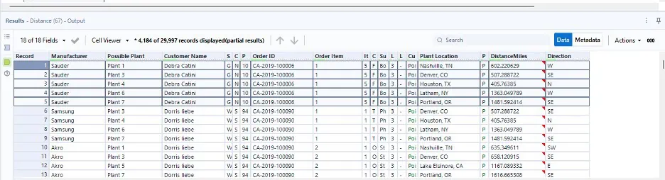 Once you run your workflow, you’ll see that you now have two new columns to your data. “DistanceMiles” is the distance, in your selected unit of measure, between the plant location and the customer location. The “Direction” is the direction that would be traveled between those two locations.