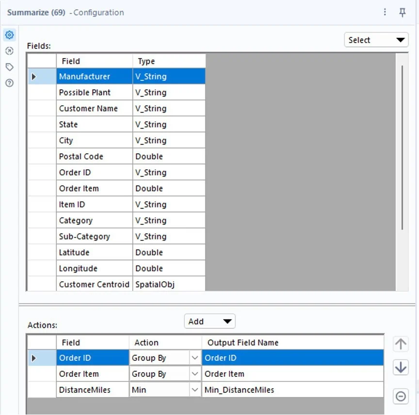To do this, we’ll add a summarize tool to our distance tool output anchor. We’ll configure it to group by the order ID and order item fields and aggregate the data to the minimum distance.